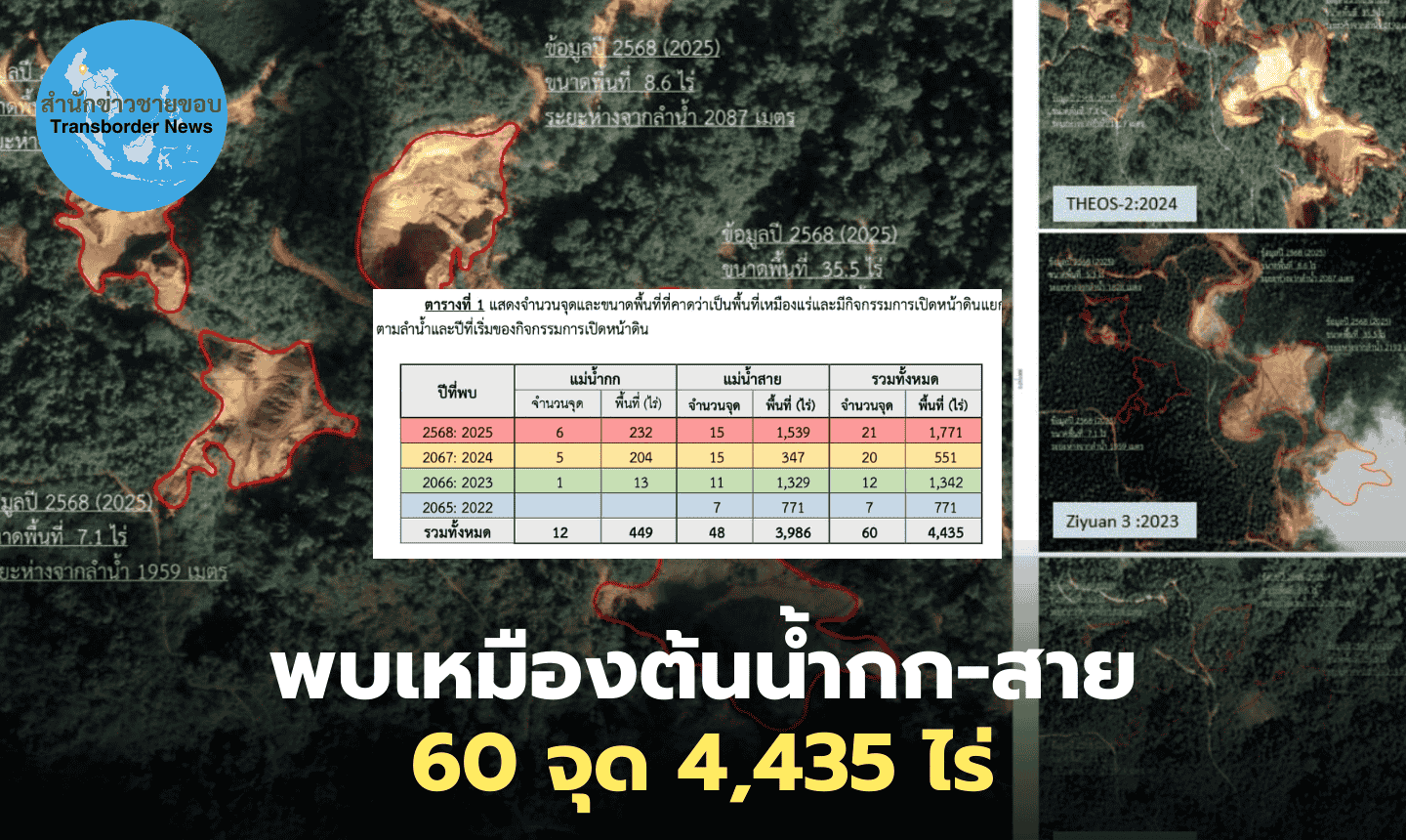 “จิสด้า”ใช้ดาวเทียมตรวจสอบเหมืองต้นแม่น้ำกก-แม่น้ำสายในรัฐฉานพบ 60 จุด เนื้อที่รวมกว่า 4 พันไร่ 22 สิงหาคม, 2025