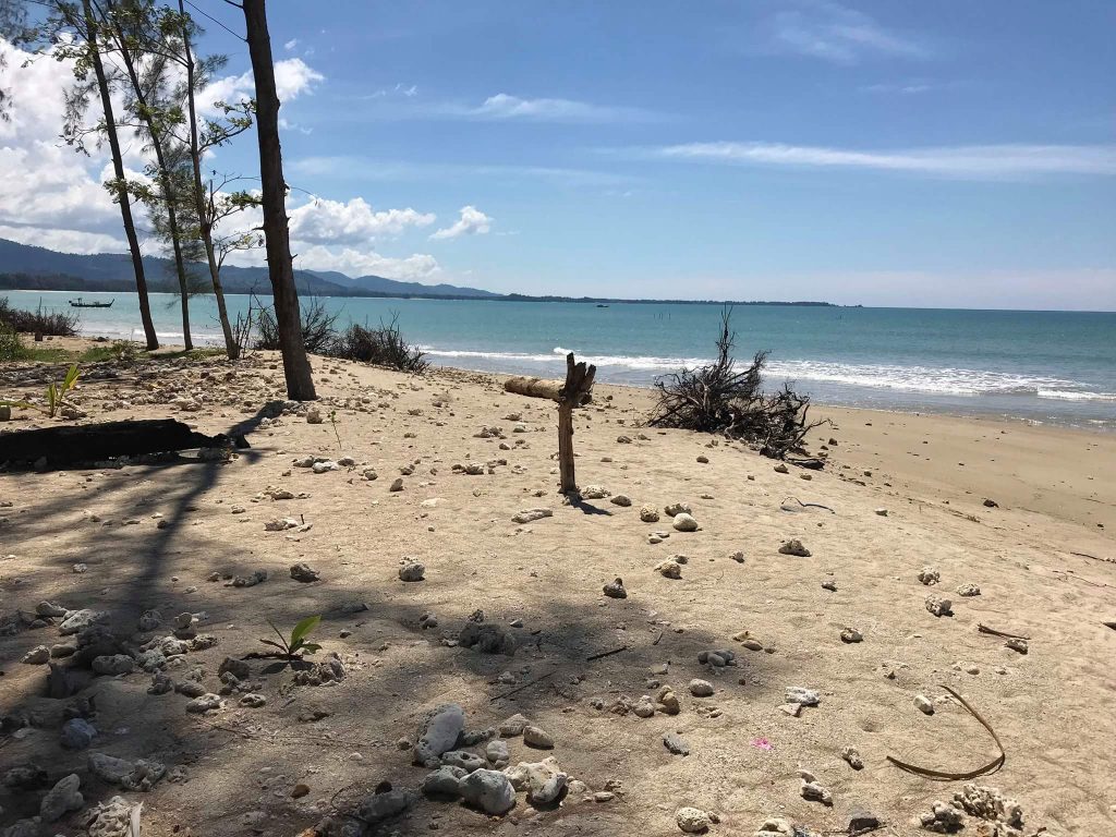 “พอเหลือบไปที่ขอบฟ้าในทะเลเห็นคลื่นสูงมาแต่ไกล ตอนแรกคิดว่าคงวิ่งหนีทันเพราะอยู่ห่างมาก แต่ที่ไหนได้แป๊บเดียวมาถึงตัว ป้าเลยพยายามเอื้อมมือไปเกาะต้นสน แต่น้ำมันแรงมากเอื้อมไป 2 ครั้งเกาะไม่ติด พอครั้งที่ 3 อธิษฐานให้พ่อตาสามพันช่วยด้วยถึงคว้าต้นสนไว้ได้ ตอนนั้นน้ำกำลังลดแรง พัดพาทุกสิ่งทุกอย่างลงทะเล โชคดีที่ป้ารอดมาได้” ผมจำไม่ได้ว่าฟังป้าลาภเล่าถึงประสบการณ์ช่วงประสบเหตุสึนามิมาแล้วกี่ครั้ง แต่ทุกครั้งที่ถ่ายทอด ทั้งคนฟังและคนเล่าต่างก็ยังรู้สึกระทึกใจเหมือนเดิม