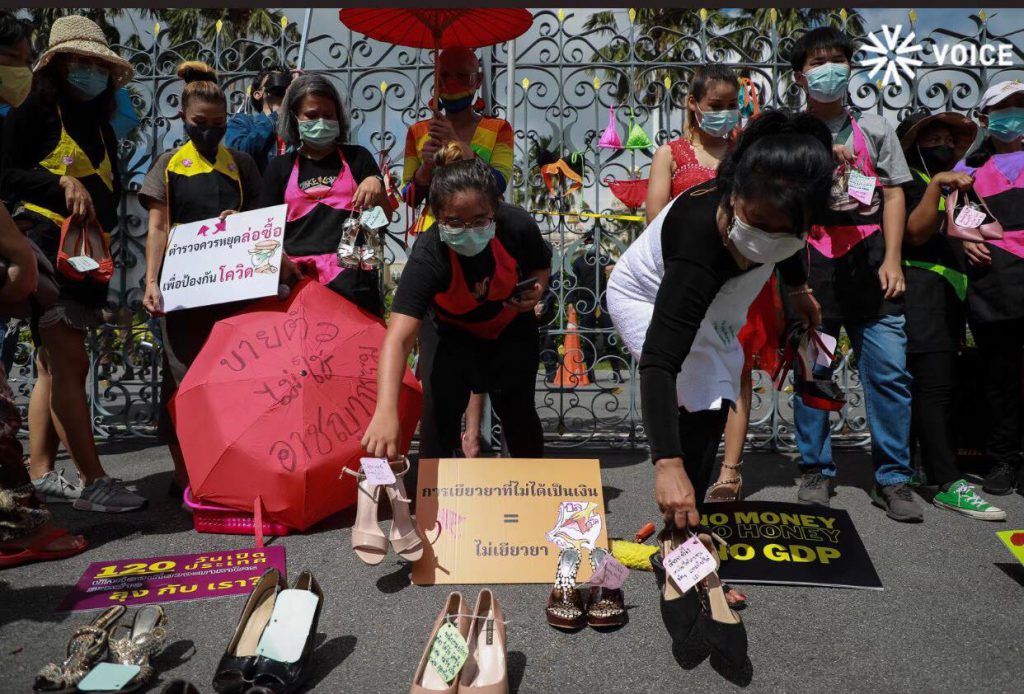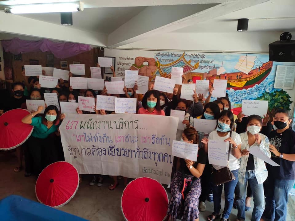 “โควิดส่งผลกระทบทางเศรษฐกิจทำให้สถานบริการขนาดกลางและขนาดเล็กต้องปิดตัวลง พนักงานถูกให้ออก เกิดภาวะตกงานทั่วประเทศ อีกทั้งการบริหารจัดการแก้ไขของรัฐบาลที่ไม่มีประสิทธิภาพและล่าช้า แม้ว่ารัฐบาลจะได้ออกมาตรการต่าง ๆ มาช่วยเหลือประชาชน เช่น โครงการเราชนะ เราไม่ทิ้งกัน เรารักกัน หรือเงินช่วยเหลือจากประกันสังคม ซึ่งพบว่าเงินเยียวยาไม่เพียงพอ ไม่ทั่วถึง บางมาตรการก็เข้าไม่ถึงโดยเฉพาะพนักงานบริการที่ไม่มีประกันสังคม ที่มีถึง90% และพนักงานบริการที่เป็นแรงงานข้ามชาติหรือชาติพันธุ์”แถลงการณ์ระบุ