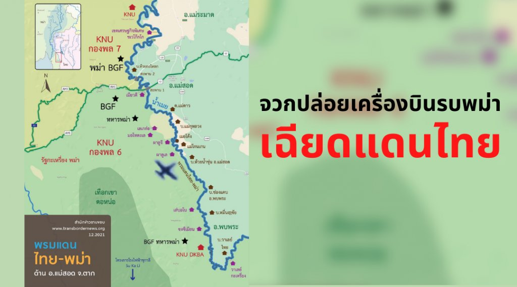 หมายเหตุ-ภาพแผนที่บริเวณการสู้รบชายแดนตรงข้าม อ.แม่สอด ส่วนเครื่องบินรบของกองทัพพม่าเป็นลำที่บินโจมตีทหารกะเหรี่ยง KNU บริเวณชายแดนสาละวินใกล้บ้านท่าตาฝั่ง อ.แม่สะเรียง จ.แม่ฮ่องสอน ซึ่งนำมาทำกราฟิคเพื่อจำลองเหตุการณ์จริง