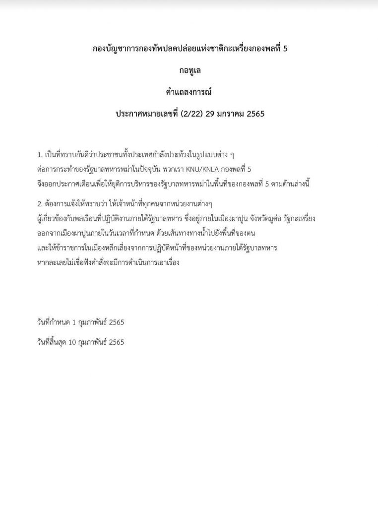 2. ต้องการแจ้งให้ทราบว่า ให้เจ้าหน้าที่ทุกคนจากหน่วยงานต่างๆ ผู้เกี่ยวข้องกับพลเรือนที่ปฏิบัติงานภายใต้รัฐบาลทหาร ซึ่งอยู่ภายในเมืองผาปูน จังหวัดมูด่อ รัฐกะเหรี่ยง ให้ออกจากเมืองผาปูนภายในวันเวลาที่กำหนดคือระหว่างวันที่ 1-10 กุมภาพันธ์ 2565 ด้วยเส้นทางทางน้ำไปยังพื้นที่ของตน และให้ข้าราชการในเมืองหลีกเลี่ยงจากการปฏิบัติหน้าที่ของหน่วยงานภายใต้รัฐบาลทหาร หากละเลยไม่เชื่อฟังคำสั่งจะมีการดำเนินการเอาเรื่อง