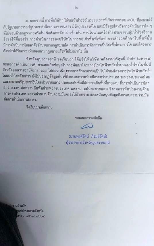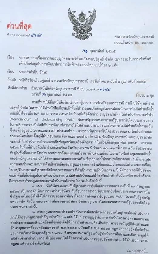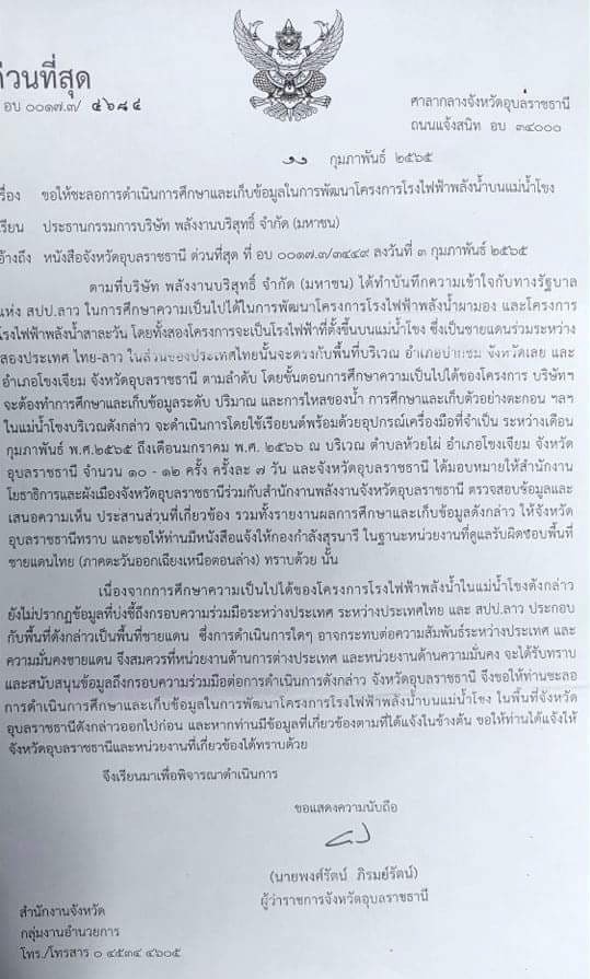 เมื่อวันที่ 15 กุมภาพันธ์ 2565 นางสาวคำปิ่น อักษร เปิดเผยว่า ได้รับจดหมายชี้แจงจากทางจังหวัดหวัดอุบลราชธานี ลงวันที่ เมื่อวันที่ 13 กุมภาพันธ์ 2565 โดยในเนื้อหาในจดหมายระบุว่า ทางจังหวัดอุบลราชธานี ได้ดำเนินการแจ้งให้บริษัทพลังงานบริสุทธิ์ จำกัด (มหาชน) ชะลอการดำเนินการศึกษาและเก็บข้อมูลในการพัฒนาโครงการไฟฟ้าพลังน้ำบนแม่น้ำโขงในพื้นที่จังหวัดอุบลราชธานีออกไปก่อน เนื่องจากการศึกษาความเป็นไปได้ของโครงการโรงไฟฟ้าพลังน้ำในแม่น้ำโขงดังกล่าว ยังไม่ปรากฏข้อมูลที่บ่งชี้ถึงกรอบความร่วมมือระหว่างประเทศไทยและสปป.ลาว ซึ่งการดำเนินการใด ๆ อาจจะกระทบต่อความสัมพันธ์ระหว่างประเทศ และความมั่นคงชายแดน จึงสมควรที่หน่วยงานด้านการต่างประเทศ และหน่วยงานด้านความมั่นคงจะได้รับทราบและสนับสนุนข้อมูลต่อการดำเนินการดังกล่าว ทั้งนี้ทางจังหวัดได้แนบจดหมายอย่างเป็นทางการ ที่แจ้งให้บริษัทชะลอการดำเนินการกล่าวลงวันที่ 11 กุมภาพันธ์ 2565 ที่ผ่านมา มาให้กับเครือข่ายชุมชนคนฮักน้ำของด้วย