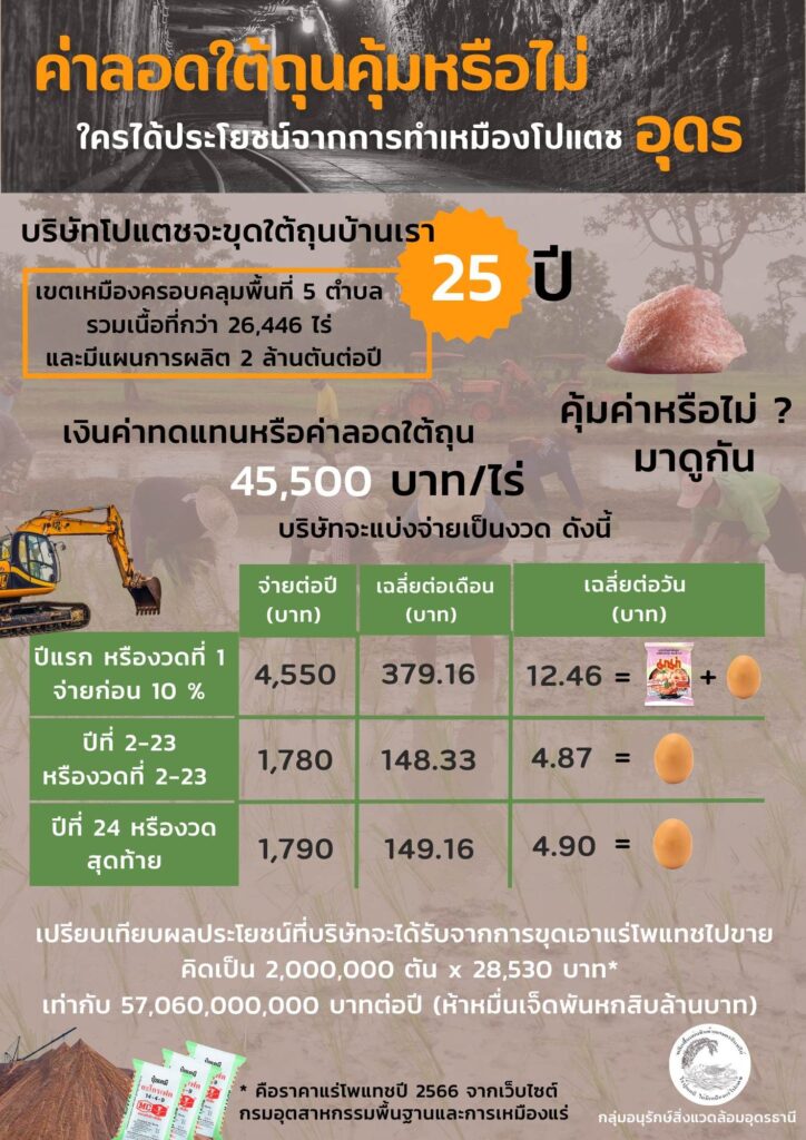 หนังสือระบุว่า อย่างไรก็ดี ตามเอกสารปรากฏ เรื่อง แนวทางและขั้นตอนปฏิบัติ การขอรับเงินค่าทดแทนสำหรับการทำเหมืองใต้ดินของบริษัทเอกชนได้กำหนดเงินค่าทดแทน หรือชาวบ้านเรียกว่า “ค่าลอดใต้ถุน” ให้กับผู้มีกรรมสิทธิ์หรือมีสิทธิครอบครองในที่ดินในเขตประทานบัตร ในอัตรา 45,500 บาทต่อไร่ ซึ่งกลุ่มอนุรักษ์สิ่งแวดล้อมอุดรธานี ได้พบเห็นการเอารัดเอาเปรียบและความไม่เป็นธรรมจากการกำหนดราคาเงินค่าทดแทนให้กับประชาชนผู้เป็นเจ้าของพื้นที่ในเขตเหมืองกว่า 26,400 ไร่