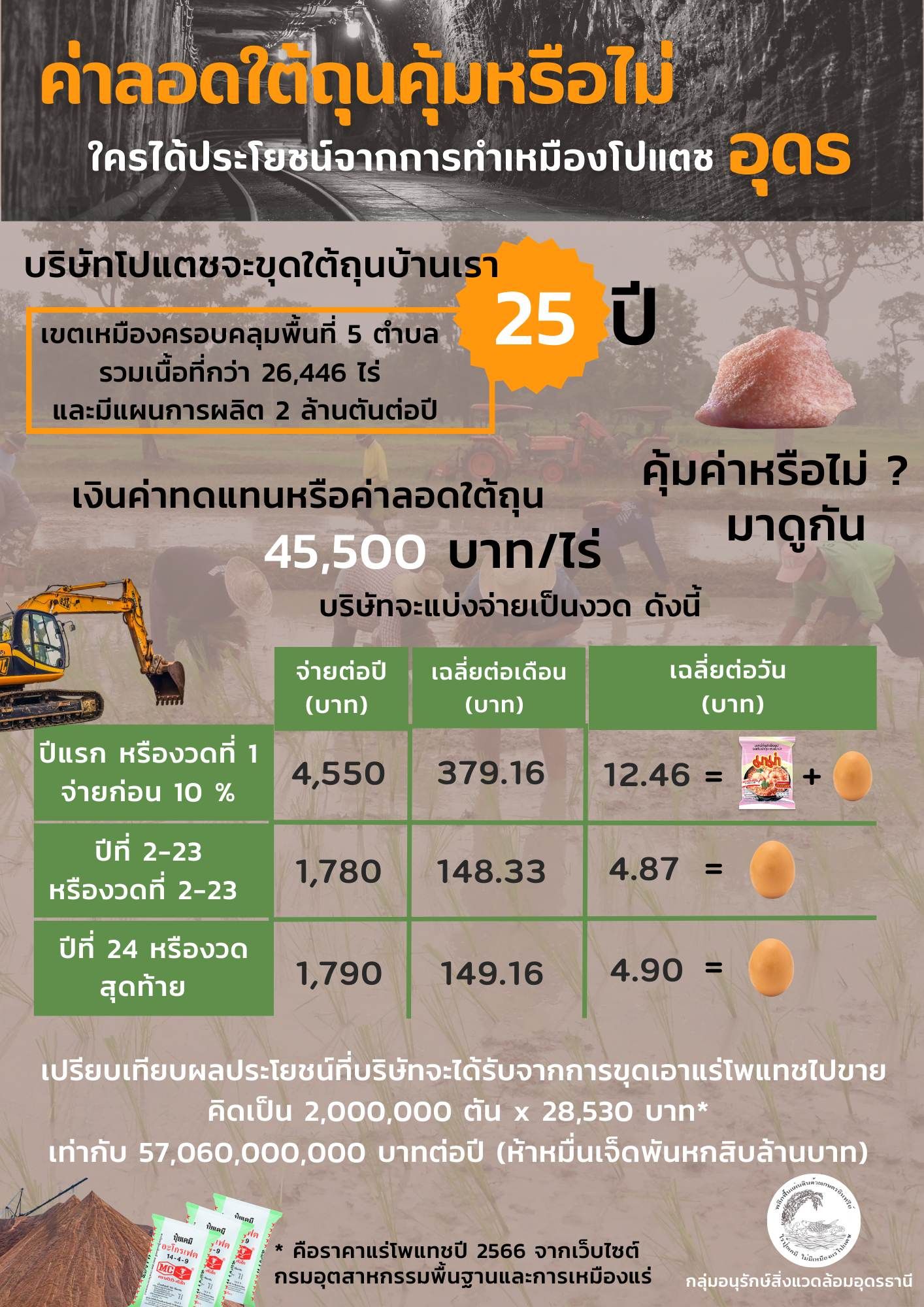 เมื่อวันที่ 25 พฤษภาคม 2566 ที่ศาลากลางจังหวัดอุดรธานี ชาวบ้านกลุ่มอนุรักษ์สิ่งแวดล้อมอุดรธานี กว่า 100 คน ได้รวมตัวกันยื่นหนังสือแก่ผู้ว่าราชการจังหวัดอุดรธานี เพื่อคัดค้านการจ่ายเงินค่าทดแทน กรณีโครงการเหมืองแร่โปแตช จังหวัดอุดรธานี โดยเนื้อในหนังสือระบุว่าตามที่รัฐบาลและหน่วยงานราชการที่เกี่ยวข้องได้อนุญาตออกประทานบัตร การทำเหมืองใต้ดิน ชนิดแร่โพแทช ให้แก่ บริษัทเอกชนแห่งหนึ่งจำนวน 4 แปลง รวมเนื้อที่กว่า 26,400 ไร่ และมีอายุประทานบัตร 25 ปี และได้มีการดำเนินการตามพระราชบัญญัติ แร่ พ.ศ.2560 ว่าด้วยการกำหนดเงินค่าทดแทน โดยคณะกรรมการกำหนดเงินค่าทดแทน ซึ่งมีผู้ว่าราชการฯเป็นประธาน และอุตสาหกรรมจังหวัดอุดรธานีเป็นผู้กำกับดูแลและประชาสัมพันธ์ให้กับประชาชนในพื้นที่ได้รับทราบ