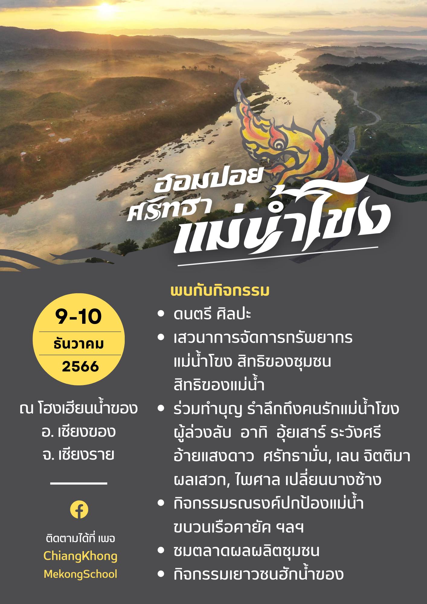 อนึ่งในวันที่ 9-10 ธันวาคม 2566 จะมีการจัดงานใหญ่ “ฮอมปอย ศรัทธาแม่น้ำโขง”ขึ้นที่โฮงเฮียนแม่น้ำโขง อ.เขียงของ จ.เชียงราย โดยกิจกรรมเริ่มต้นตั้งแต่เช้าวันที่ 9 ธันวาคม โดยการทำบุญและรำลึกถึงนักต่อสู้เพื่อแม่น้ำโขงที่ล่วงลับ อาทิ แสงดาว ศรัทธามั่น ,อุ้ยเสาร์ ระวังศรี ,จิตติมา ผลเสวกและไพศาล เปลี่ยนบางช้าง ช่วงบ่ายจะมีงานเสวนา 2 เวทีซึ่งมีทั้งเสียงสะท้อนจากชุมชนและมีผู้ทรงคุณวุฒิต่างๆ ส.ส. รวมถึงตัวแทนสถานเอกอัครราชทูตสหรัฐฯ จีน และออสเตรเลีย ร่วมเสนอมุมมองเกี่ยวกับแม่น้ำโขง หลังจากนั้นจะมีการแสดงศิลปะสาขาต่างๆและการดนตรีในช่วงค่ำ ที่น่าสนใจคือจะมีร้านค้าผลิตภัณฑ์ชุมชนร่วมขายสินค้าท้องถิ่น ส่วนในช่วงเช้าวันที่ 10 ธันวาคม มีขบวนเรือคายัครณรงค์ปกป้องแม่น้ำโขง ก่อนปิดท้ายด้วยการอ่านคำประกาศเพื่อแม่น้ำโขง