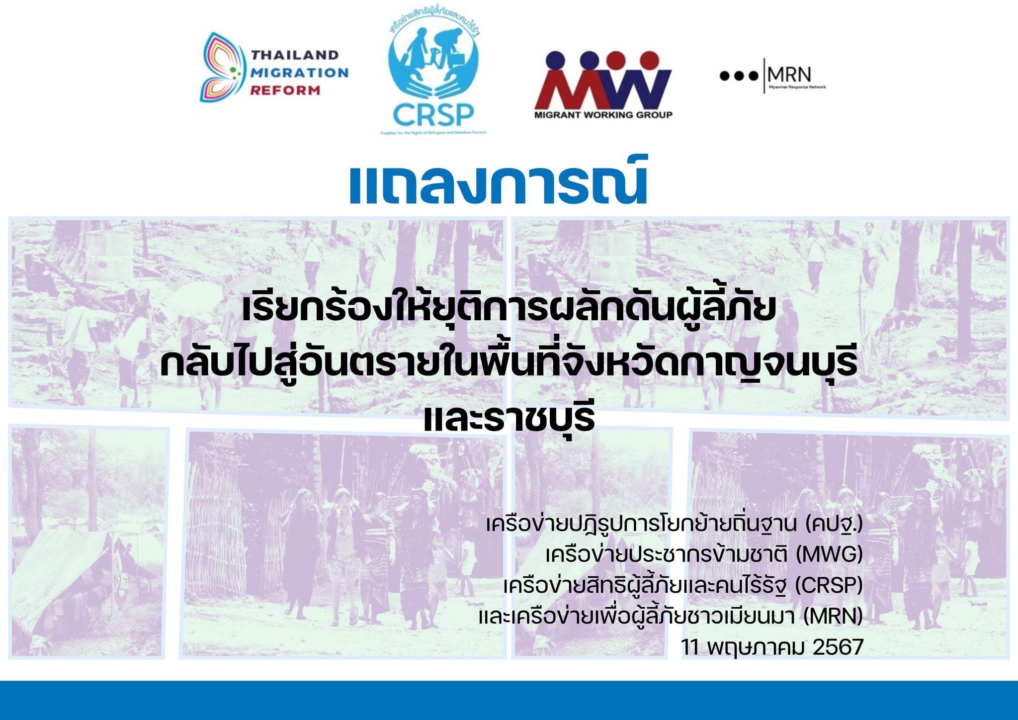 เมื่อวันที่ 11 พฤษภาคม 2567 ภาคีเครือข่ายองค์กรที่ทำงานด้านสิทธิมนุษยชน-สถานะบุคคลและผู้ลี้ภัย ซึ่งประกอบด้วย เครือข่ายปฏิรูปการโยกย้ายถิ่นฐาน (คปฐ.) เครือข่ายประชากรข้ามชาติ (MWG) เครือข่ายสิทธิผู้ลี้ภัยและคนไร้รัฐ (CRSP) และ เครือข่ายเพื่อผู้ลี้ภัยชาวเมียนมา (MRN) ได้ออกแถลงการณ์เรียกร้องให้รัฐบาลไทยยุติการผลักดันผู้ลี้ภัยกลับไปสู่อันตรายในพื้นที่ จ.กาญจนบุรีและราชบุรี โดยระบุว่า สถานการณ์ความไม่สงบในประเทศเมียนมาเมื่อต้นเดือนพฤษภาคมที่ผ่านมา ทำให้มีผู้หนีภัยเข้ามาในประเทศไทยในพื้นที่ บ้านบ้องตี้บน ต.บ้องตี้ อ.ไทรโยค จ.กาญจนบุรี ประมาณ 2,300 คน โดยกระจายกันอยู่กับเครือญาติในชุมชนฝั่งไทย