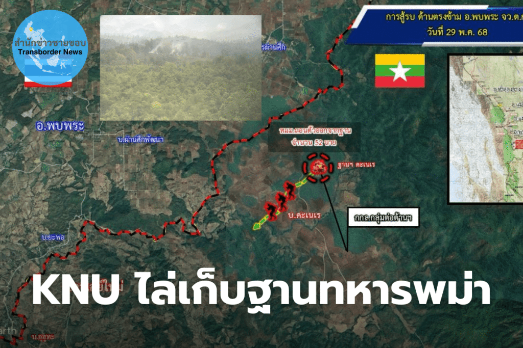 เมื่อวันที่ 29 พฤษภาคม 2568 รายงานข่าวจากทหารกองกำลังราชมนู อ.แม่สอด จ.ตาก แจ้งว่า เมื่อ 28 พฤษภาคมที่ผ่านมา เวลาประมาณ 09.45 น. กองกำลังปลดปล่อยชาติกะเหรี่ยง (Karen National Liberation Army–KNLA) กองพลน้อยที่ 6 ร่วมกับกองกำลังพิทักษ์ประชาชน หรือ PDF ( People’s Defence Force) ได้ใช้อากาศยานไร้คนขับ (โดรน) ทิ้งระเบิดเป็นระยะ ๆ โจมตีที่ตั้งทหารเมียนมา พัน.ร.32 , พัน.คร.555 และ ร้อย.ป.315 ฐานคะเนเรซึ่งเป็นฐานสำคัญ บ้านคะเนเร อำเภอวาเลย์ใหม่ จังหวัดเมียวดี รัฐกะเหรี่ยง สหภาพเมียนมา ซึ่งอยู่ด้านตรงข้ามบ้านทหารผ่านศึก ม.4 ตำบลรวมไทยพัฒนา อำเภอพบพระ จังหวัดตาก ห่างจากแนวชายแดนประมาณ 3 กม.