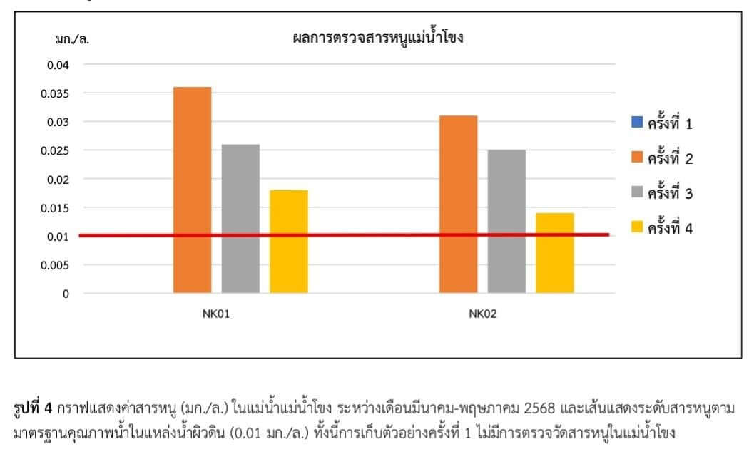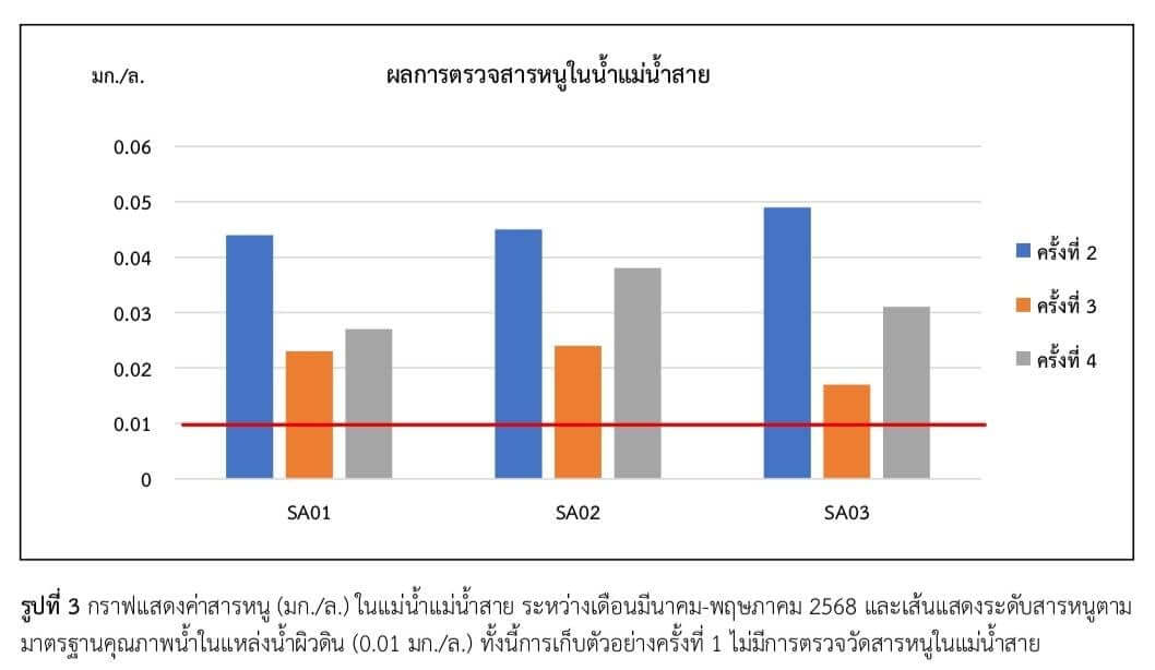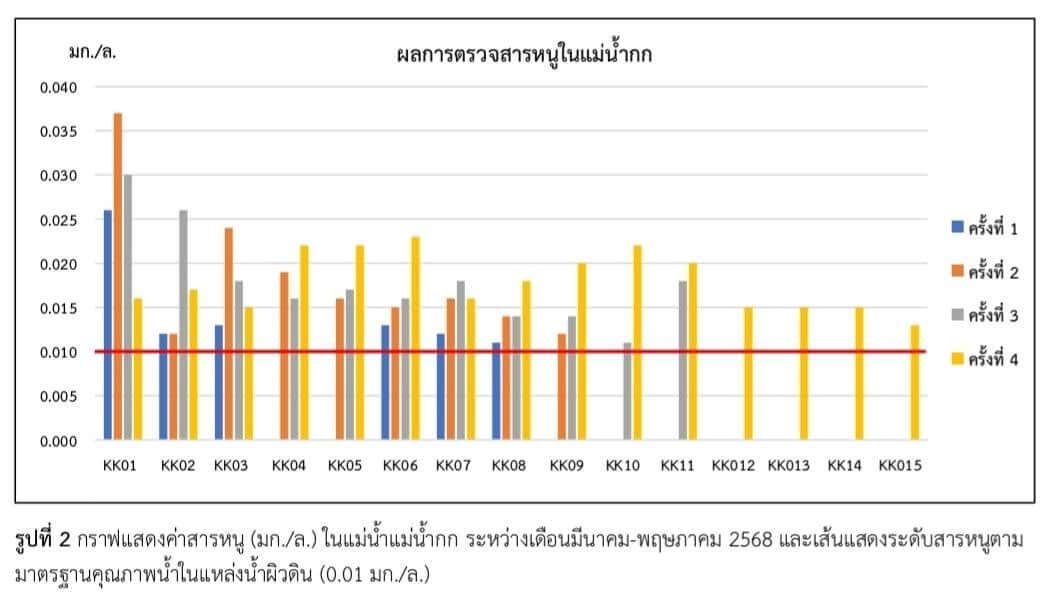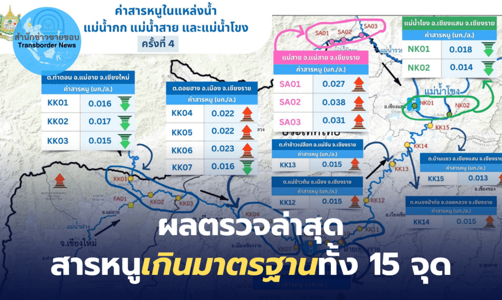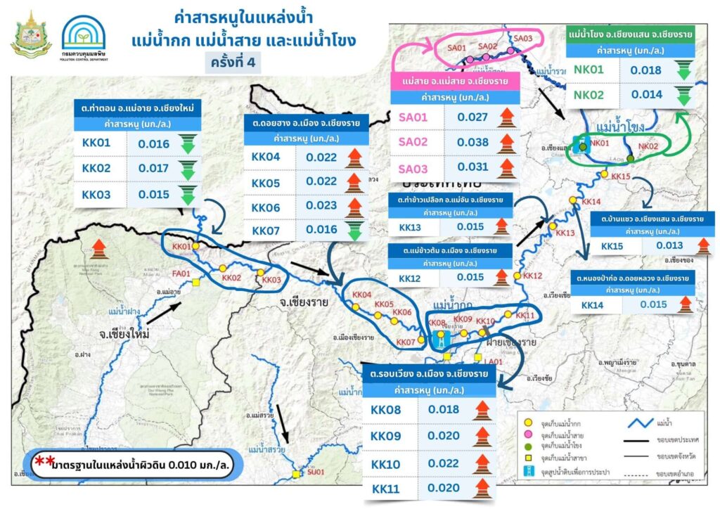เมื่อวันที่ 10 มิถุนายน 2568 เฟซบุ๊กของกรมควบคุมมลพิษ (คพ.) รายงานผลการตรวจคุณภาพน้ำ “แม่น้ำกก” ครั้งที่ 4 โดยได้กำหนดจุดตรวจวัดคุณภาพสิ่งแวดล้อมเพื่อตรวจวัดคุณภาพน้ำและตะกอนดิน ในแม่น้ำกก 15 จุด และลำน้ำสาขาที่ไหลลงแม่น้ำกก แม่น้ำฝาง แม่น้ำลาว แม่น้ำกรณ์ แม่น้ำสรวย และแม่น้ำสาย 3 จุด แม่น้ำโขง 2 จุด จากการเก็บตัวอย่างคุณภาพน้ำระหว่างวันที่ 26 – 30 พฤษภาคม 2568 พบว่า “สารหนู” (As) เกินมาตรฐาน 0.010 มิลลิกรัมต่อลิตร (มก./ล.) ทั้ง 15 จุด ดังนี้