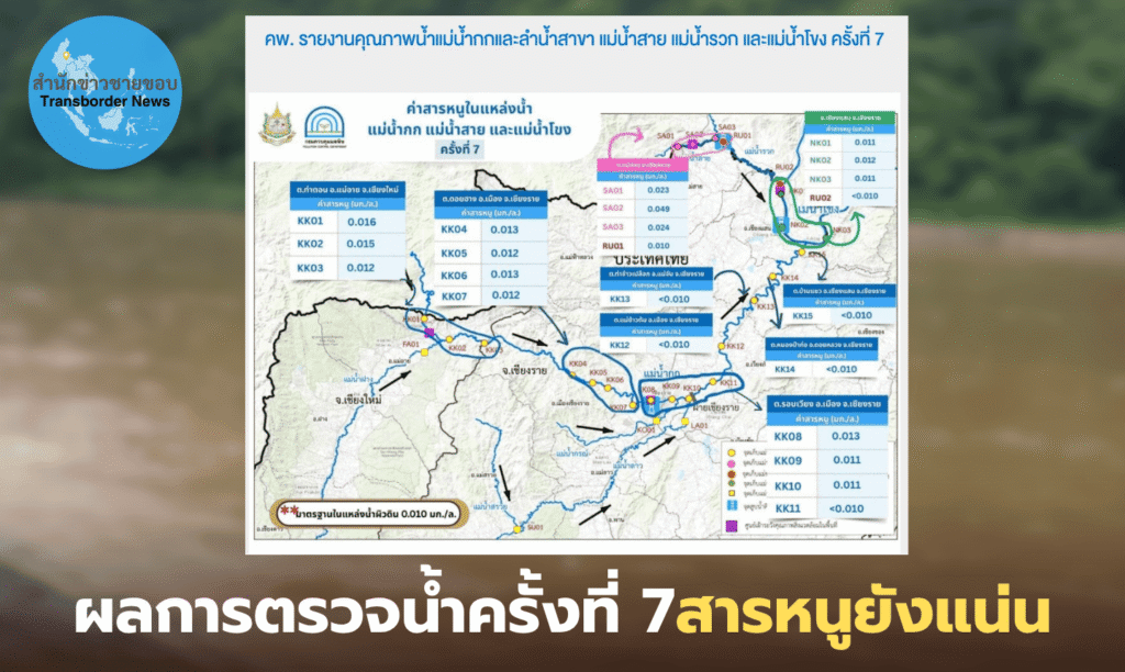 เมื่อวันที่ 24 กรกฎาคม 2568 เพจของกรมควบคุมมลพิษ (https://www.pcd.go.th/pcd_news/36237) ได้รายงานการตรวจวัดคุณภาพน้ำของแม่น้ำกก แม่น้ำสาย แม่น้ำรวกและแม่น้ำโขง โดยระบุว่าจากกรณีปัญหาแม่น้ำกกมีความขุ่นผิดปกติ กรมควบคุมมลพิษ (คพ.) กระทรวงทรัพยากรธรรมชาติและสิ่งแวดล้อม(ทส.) ได้กำหนดจุดตรวจวัดคุณภาพสิ่งแวดล้อมเพื่อตรวจวัดคุณภาพน้ำและตะกอนดิน ในแม่น้ำกก 15 จุด และลำน้ำสาขาที่ไหลลงแม่น้ำกก ได้แก่ แม่น้ำฝาง แม่น้ำลาว แม่น้ำกรณ์ แม่น้ำสรวย