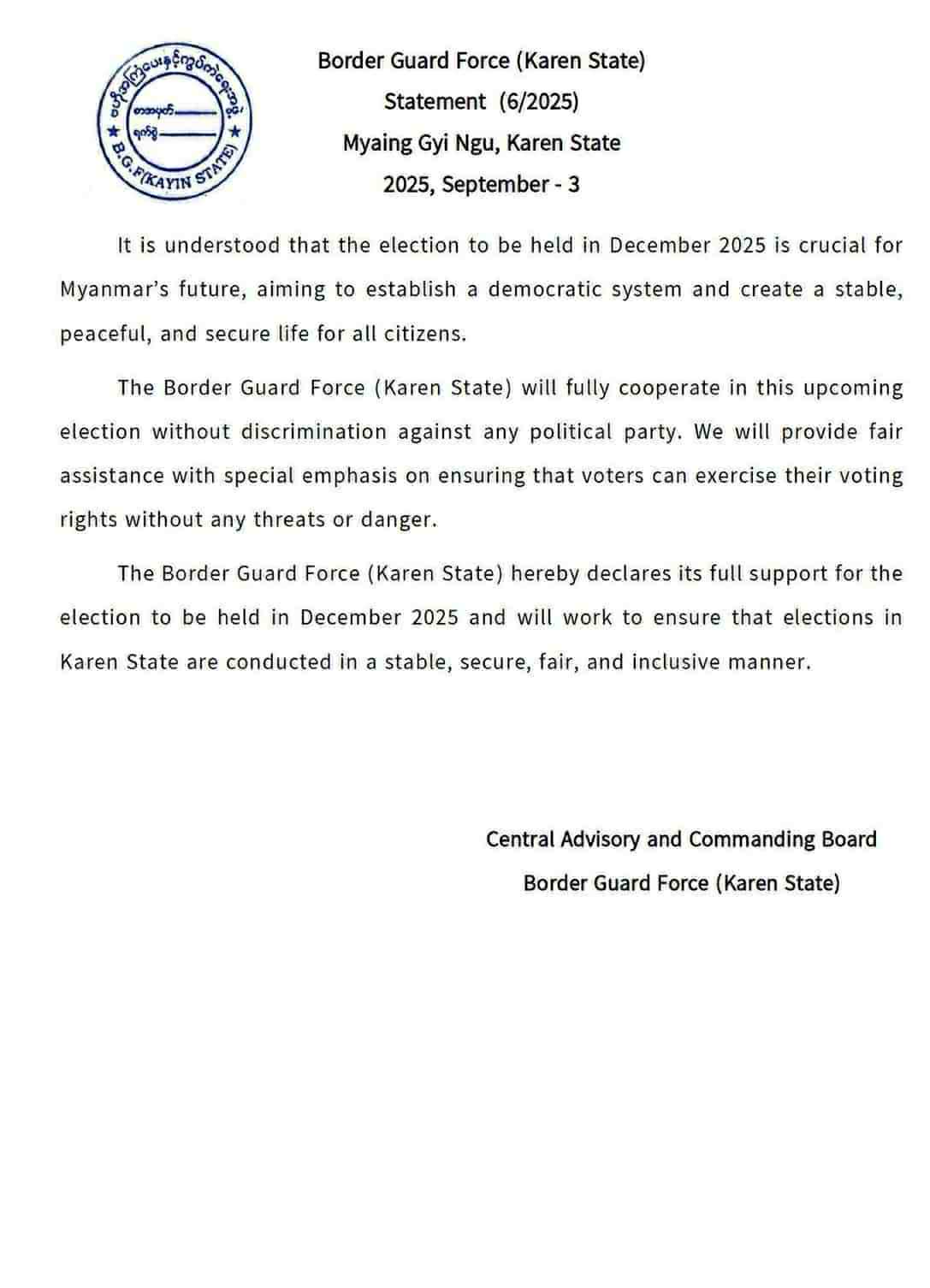 กองกำลังพิทักษ์ชายแดน (รัฐกะเหรี่ยง) จะให้ความร่วมมืออย่างเต็มที่ในการเลือกตั้งครั้งนี้ โดยไม่เลือกปฏิบัติต่อพรรคการเมืองใด ๆ เราจะให้ความช่วยเหลืออย่างเป็นธรรม โดยมุ่งเน้นเป็นพิเศษเพื่อให้แน่ใจว่าประชาชนสามารถใช้สิทธิเลือกตั้งได้โดยปราศจากการข่มขู่หรืออันตรายใด ๆ BGF ขอประกาศการสนับสนุนอย่างเต็มที่ต่อการเลือกตั้งที่จะจัดขึ้นในเดือนธันวาคม 2568 และจะทำงานเพื่อให้แน่ใจว่าการเลือกตั้งในรัฐกะเหรี่ยงเป็นไปอย่างมั่นคง ปลอดภัย เป็นธรรม และครอบคลุมทุกฝ่าย