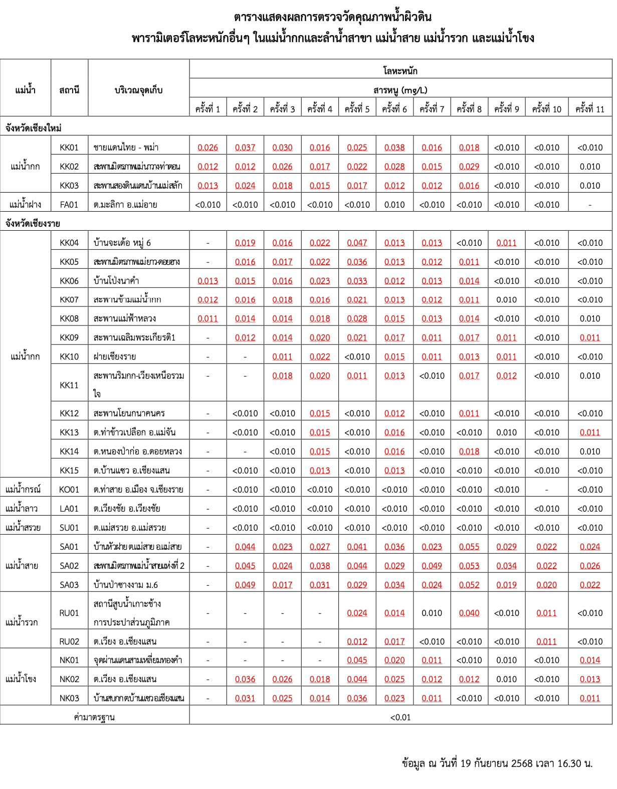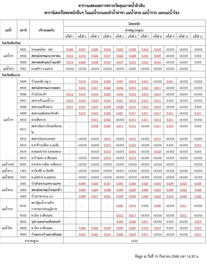 เมื่อวันที่ 3 ตุลาคม 2568 กรมควบคุมมลพิษ ได้รายงานคุณภาพน้ำแม่น้ำกกและลำน้ำสาขา แม่น้ำสาย แม่น้ำรวก และแม่น้ำโขง ครั้งที่ 11 จากจุดตรวจวัดแม่น้ำกก 15 จุด แม่น้ำสาย 3 จุด แม่น้ำรวก 2 จุด และแม่น้ำโขง 3 จุด โดยเก็บตัวอย่างน้ำระหว่างวันที่ 1 – 5 กันยายน 2568 โดยพบว่า 1.แม่น้ำกก จุดตรวจวัดส่วนใหญ่มีค่าสารหนูเป็นไปตามมาตรฐานที่กำหนด มีเพียงบางจุดที่พบค่าสารหนูเกินค่ามาตรฐาน ได้แก่ สะพานเฉลิมพระเกียรติ1 ต.รอบเวียง อ.เมือง จ.เชียงราย มีค่าสารหนู 0.011 มก./ล.(ค่ามาตรฐานอยู่ที่ 0.01 มก./ล.) และแม่น้ำกกบริเวณ ท่าข้าวเปลือก อ.แม่จัน มีค่าสารหนู 0.011 มก./ล. อย่างไรก็ตามพบว่ามี 5 จุดที่พบสารหนู 0.010 มก./ล.ซึ่งเท่ากับค่ามาตรฐาน