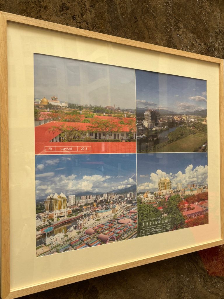 รูปภาพแต่ละฝั่งแสดงถึงสัมพันธภาพของจ้าว เหวย กับตัวแทนจากรัฐบาลลาว ภาพของการเจริญเติบโตของพื้นที่ตั้งแต่อดีตจนถึงปัจจุบันและการเยี่ยมเยียนของคณะทูตจากต่างประเทศในเขตเศรษฐกิจพิเศษแห่งนี้