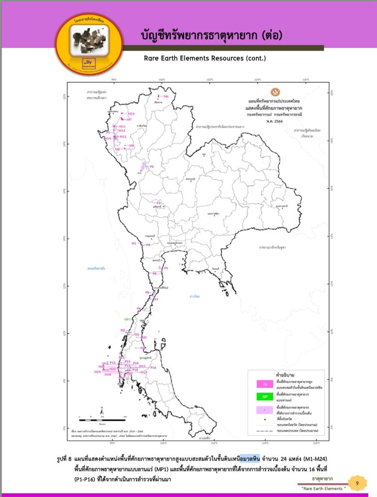 นายธวัชชัยกล่าวว่า พบว่าในไทยมีศักยภาพ มีสายแร่เกาะตามแนวหินแกรนิตทอดยาวตั้งแต่ จ.แม่ฮ่องสอน ไปจนถึงภูเก็ตแล้วลงไปถึงจังหวัดชายแดนภาคใต้ เวลาเราพูดถึงแรร์เอิร์ธมันจะพูดถึงอยู่แค่ตัวเดียว แต่จริงๆแล้วแร่หายากจะอยู่กันทั้งกลุ่มเพียง แต่ว่าสัดส่วนของแต่ละตัวจะมากน้อยแตกต่างกันไป จากที่เราสำรวจเบื้องต้นแหล่งที่เราพบแร่หายากมากกว่าตัวอื่นๆคือแร่ซีเรียม (Ce) และตัว อิตเทรียม แลนทานัม (La) นีโอดิเมียม (Nd) เป็น 4 ตัวหลักๆที่จะเจอในปริมาณที่สูงกว่าแร่หายากตัวอื่นๆ แต่ประเด็นคือพวกนี้ราคาไม่สูง เพราะฉะนั้นการจะพัฒนาแหล่งขึ้นมาต้องไปหาว่าแหล่งไหนมีธาตุหายากตัวอื่นโดยเฉพาะธาตุหนักซึ่งจะมีราคาสูง เช่น ดิสโพรเซียม (Dy) ถ้ามีสัดส่วนเพิ่มในแหล่งใดแหล่งหนึ่งมันก็จะมีโอกาสที่จะพัฒนาขึ้นมาได้ในเชิงของการคุ้มทุน