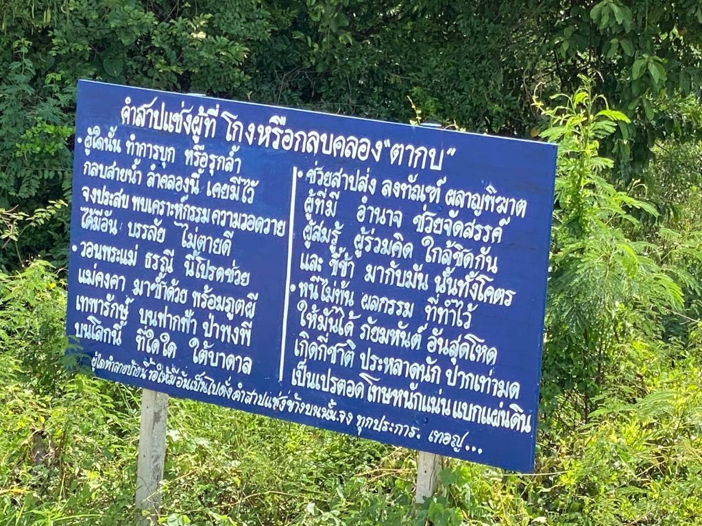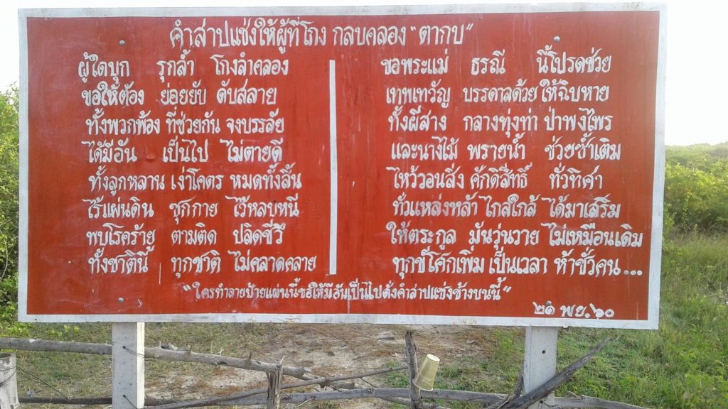 “ตอนแรกลุงจ้างคนทำป้ายสาปแช่ง คนทำป้ายรับปากแล้ว ลุงก็พร้อมจะจ่ายเงินให้ แต่ตอนหลังมีคนข่มขู่ไม่ให้ทำ จนคนทำป้ายไม่กล้า ลุงเลยทำเอง และทำอนุสาวรีย์มันเสียเลย พวกเขามันคนเยอะ ทีแรกลุงก็มีชาวบ้านในหมู่บ้านเป็นแนวร่วมหลายคน แต่ตอนนี้เหลือน้อยลงทุกทีเพราะไม่มีใครอยากยุ่ง ก็สู้เขาไม่ได้ เลยให้เป็นอนุสาวรีย์แห่งความพ่ายแพ้ก็ว่าได้” ลุงเหนาะเล่าที่มาที่ไปพร้อมเสียงหัวเราะขื่นๆระบายความความอัดอั้นตันใจ