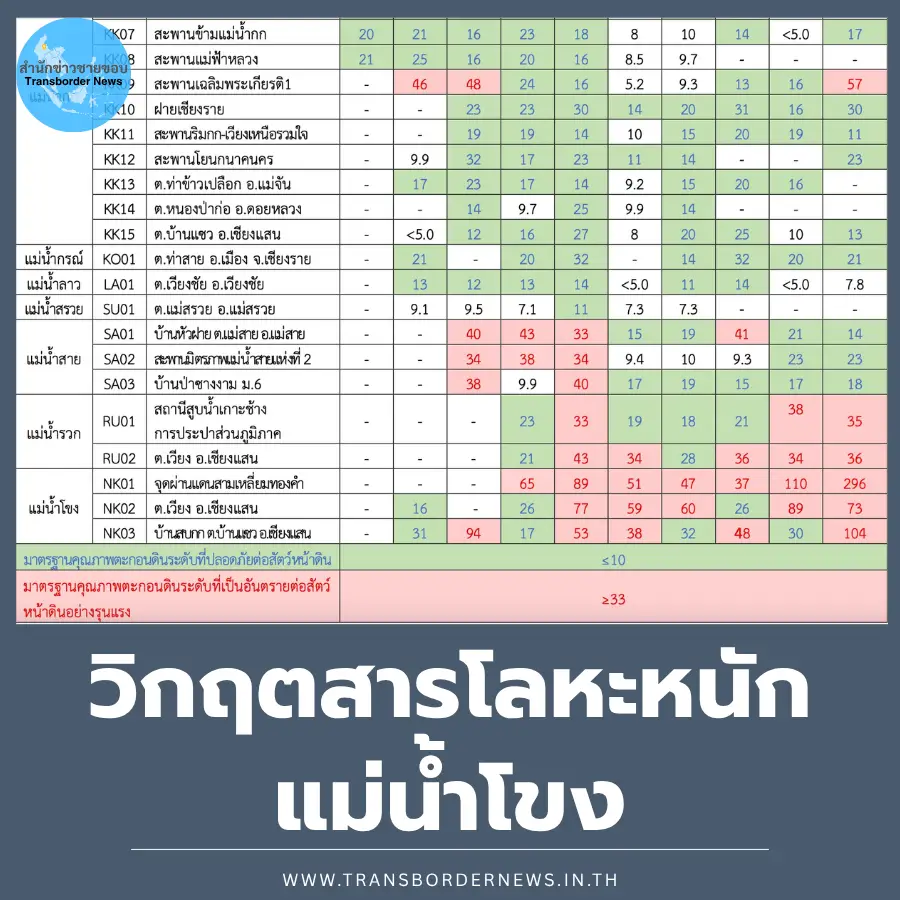 เมื่อวันที่ 10 เมษายน 2569 เพจของกรมควบคุมมลพิษ (คพ.) กระทรวงทรัพยากรธรรมชาติและสิ่งแวดล้อม ได้รายงานผลการตรวจคุณภาพน้ำและตะกอนดินในพื้นที่จังหวัดเชียงใหม่และเชียงราย โดยได้ดำเนินการเก็บตัวอย่างตะกอนดิน ครั้งที่ 10 เมื่อวันที่ 8 – 11 มีนาคม 2569 พบว่าในแม่น้ำกกพบสารหนูเกินมาตรฐานตะกอนดินระดับที่ปลอดภัยต่อสัตว์หน้าดิน จำนวน 6 จุด และพบเกินระดับที่เป็นอันตรายต่อสัตว์หน้าดินอย่างรุนแรง 3 จุด ประกอบด้วยบริเวณชายแดนไทย-พม่า ,สะพานมิตรภาพแม่นาวาง-ท่าตอน และสะพานเฉลิมพระเกียรติ(อ.เมือง จ.เชียงราย) โดยมีค่าระหว่าง 44-57 มก./กก.(ค่ามาตรฐานต่ำกว่า 33 มก./กก.)