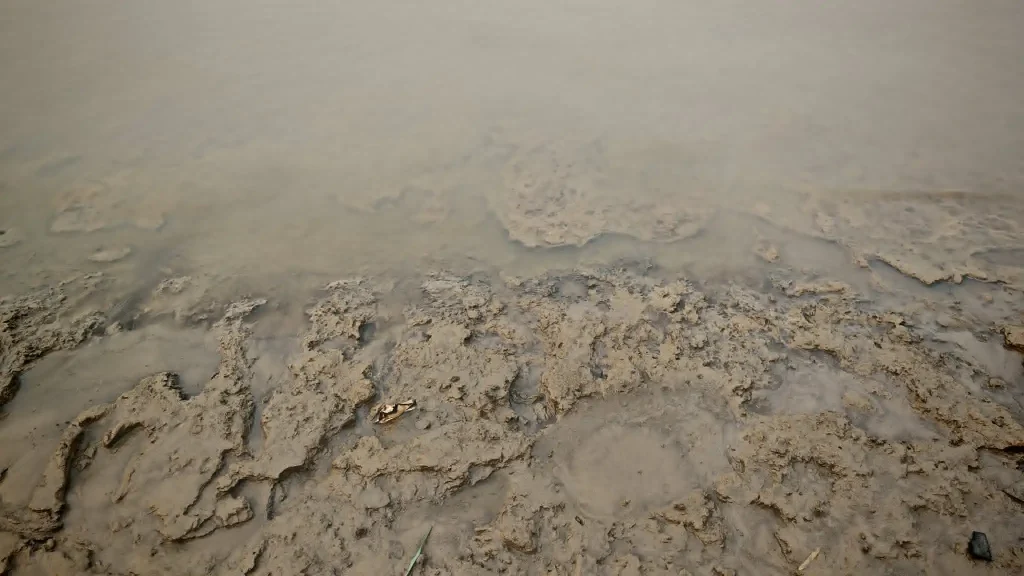 ผู้สื่อข่าวได้ลงสำรวจพื้นที่สามเหลี่ยมทองคำ บริเวณปากแม่น้ำรวกไหลลงแม่น้ำโขง เมื่อวันที่ 17 เมษายน 2568ซึ่งพบว่าดินริมฝั่งมีสีเทาอมน้ำตาล บางส่วนออกไปทาง “เทาหม่น” ในน้ำขุ่นข้น เนื้อดินมีความละเอียดสูงมาก ไม่เห็นเศษหินหรือทรายหยาบปน เมื่อสังเกตตามขอบตลิ่งจะพบโคลนเหลวที่พร้อมจะดูดเกาะติดผิวหนังทันทีเหยียบลงไปเมื่อผิวสัมผัส ขณะที่บนฝั่งดินเริ่มจับตัวเป็นก้อน มีรอยหยักและหลุมบ่อ ซึ่งช่วงนี้ระดับแม่น้ำโขงเพิ่งลดลง ตะกอนดินเหนียวเหล่านี้วาวมีความลื่น ขึ้นมาบนฝั่งห่างจากแม่น้ำดินแห้งขอดก็จะแตกตัวแผ่ขยายเป็นแผ่นๆ